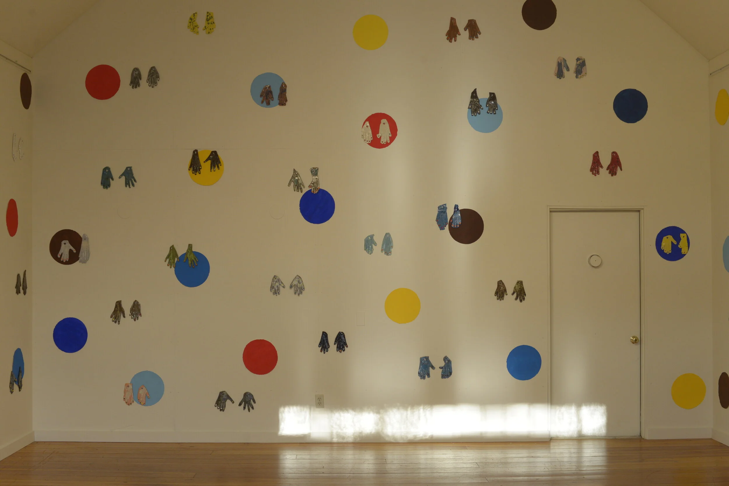 Haystack Hands is a site-specific exhibition that brings together New York-based artist Polly Apfelbaum’s 2017 series, My Hands, which consists of 100 pairs of ceramic hands that have never been shown in the US, and the site and community surrounding Haystack Mountain School of Crafts. Haystack Handsevolved from the artist’s ongoing experiments with glazed ceramics. They take their inspiration from the ‘floating hand of God’ in the mosaics of the basilica of Sant’Apollinare Nuovo in Ravenna. Apfelbaum was fascinated by this image of the disembodied hand as the symbol of creation and intervention and used her own hands as a template for these works, creating a relationship to the artist’s touch while also engaging ideas about craft and making within a contemporary field. These hands become reengaged in Deer Isle, Maine as they sit upon painted paper circles radiating the Maine flag colors of blue, brown, red, and yellow. Throughout the duration of the exhibition visitors are invited to draw their own hands.